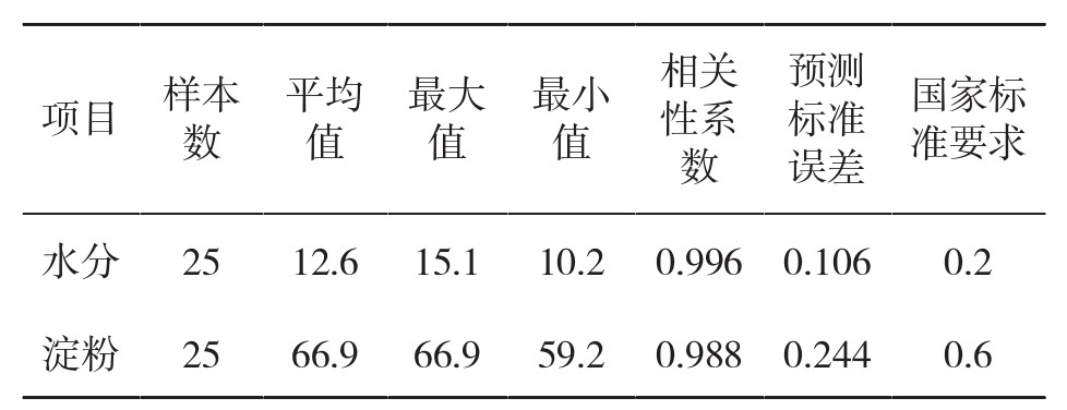 (3)整理数据,得出结论。在此阶段,录入准确的数据,利用仪器软件进行线性分析。删除差别大的样品后,选择滤光片,运用相关程序,再次进行线性分析,并利用得出校准的相关系数和预测标准误差,确定最终校准。在本次实验分析活动中,要求删除的样品数据量不能超过样品总数的10%,如果超过了该数值,那么此次所得的数据均视为无效。此次实验后,删除水分数据2组、淀粉数据5组[3]。表1为具体的校准数据和国家标准要求一览表,将本实验数据与其进行对比可知,本次校准数据合格。